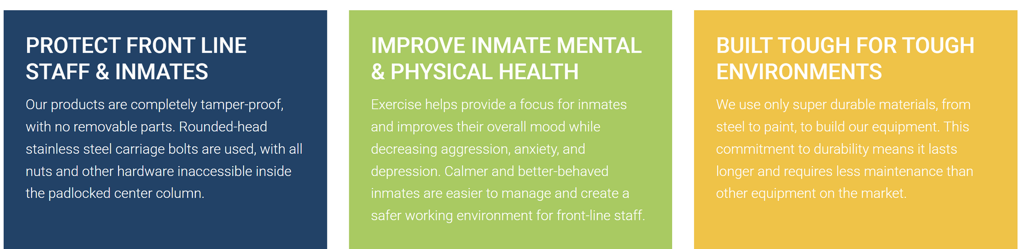 Equipment built for corrections to solve the challenges Jail Administrators face in delivering fitness options to the inmate population.